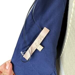 Features back zip with lace up closure, navy blue long length with vibrant pink pom pom accents down the sides.