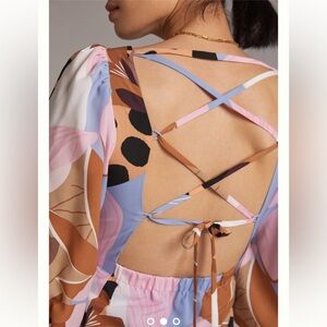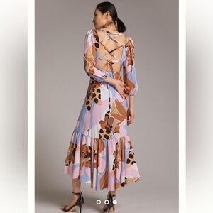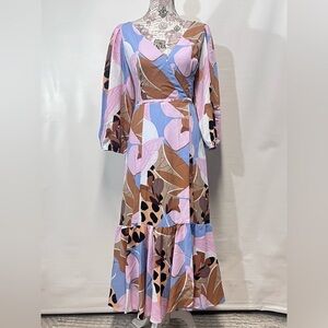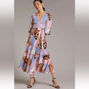 Pink, brown and periwinkle floral wrap dress from HUTCH for ANTHROPOLOGIE, size M. Dress has balloon sleeves, an open back with lace up accent and tiered skirt.