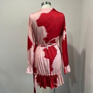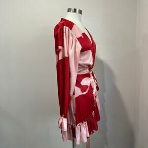 HUTCH long sleeve wrap dress in bold red and pink abstract print satin. Features a deep V-neckline, tie waist, and ruffled hem. Selling as-is — please see pictures for flaw on back.