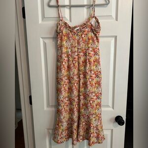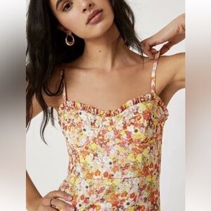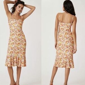 HUTCH Selene Floral Bustier Midi Dress is such a stunning piece! This Anthropologie dress features underwire bust, spaghetti straps and a ruffle at neckline and hem. Back zip closure.