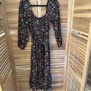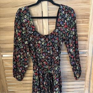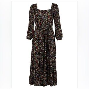 HVN Neon Floral Eva Square Neck Button Down Dress in Multicolor. The Eva midi dress from HVN has a neon floral print with a feminine squared neckline, a belted waist, and a ruffled hemline that creates the perfect feminine fit.