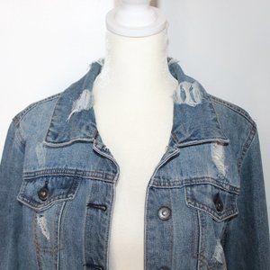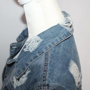 Wow! Like new medium-wash Highway Jean super-distressed jean jacket. Size L. Measures approximately 21” long from shoulder. Excellent condition!!