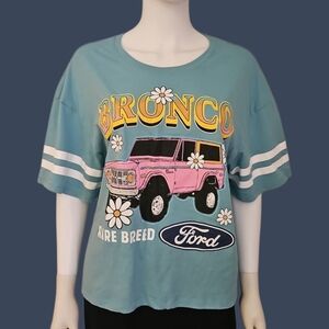 This Ford t-shirt features a fun graphic design with a classic Bronco print. The blue color adds a vibrant touch, perfect for casual wear.