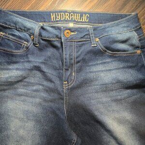 Great pair of dark blue and acid washed/distressed looking ankle skinny jeans from HYDRAULIC. "Murray" high-rise skinny ankle jeans. Gently loved, laundered and in super condition. Five-pocket design. Cotton/polyester/spandex blended fabric. SIZE 14/MEASUREMENTS: waist = 36" x rise = 11" x inseam = 27" long.