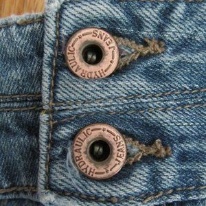HYDRAULIC WOMEN'S SIZE 9 10 BLUE SLUB DENIM JEAN SKIRT SHORT MINI DISTRESSED. Fabric: 100% Cotton. Slub jean fabric is textured with raised white lines vertically in a random pattern on the jeans. The white lines appear to be created by a thicker white thread woven into the fabric. Zip fly with intact and working zipper. Two copper color riveted metal button closures on the waistband says "HYDRAULIC -*- JEANS -*-" around the circumference. Intact and working metal zipper closure in front fly. Two patch pockets with angled openings in front. 2 patch pockets with flaps and button closures in the back. Traditional gold top stitching. The pictures show the exact item you are purchasing. ** Color may be slightly off due to monitor color setting/flash of camera **.