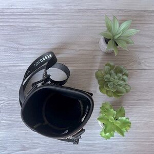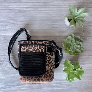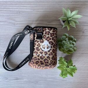HYDROJUG sleeve. Leopard print; tan and brown. Black strap. Double layer insulation. Two large pockets. Sleek hook design to make it easier than ever to attach and detach the Strap. Sleeve only; no bottle included.