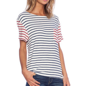 HYE PARK and LUNE Pluto boat neck short sleeve top, white with navy stripes. This brand is often worn by celebs, is made from the highest quality fabric by Lune Culture and is designed by world famous model, Hye Park. You would find this brand in stores like shopbop, Revolve and Nordstrom's.