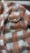 Warm sherpa jacket with checkered pattern. Features orange and cream tones. Ideal for cool weather.