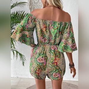 Hyfve Vibrant off-shoulder Green multicolor romper with paisley pattern. Features flared sleeves and elastic waist. Perfect for a stylish look. Great for your summer vacation, cruise, beach party, barbecue, pool party, luncheon, bridal shower, baby shower, or lounging and running errands. NWOT!! NEVER WORN!!