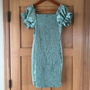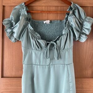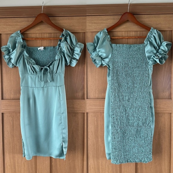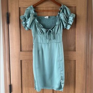 HYFVE Milkmaid Thigh Slit Smocked Back Ruffle Satin Mini Dress size Large