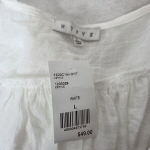 HYFVE features charming puff sleeves and a stylish tie front, perfect for adding a touch of sophistication to any outfit. The 3/4 sleeve length and ribbed texture enhance its classic appeal, making it a versatile choice for both casual and formal occasions. New with tags.