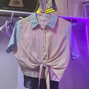 Soft pastel stripes. Button-down with tie front. Short sleeves.
