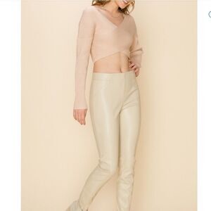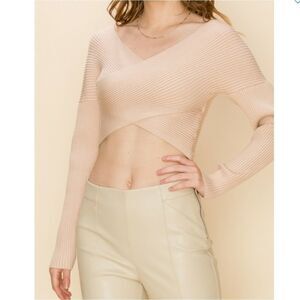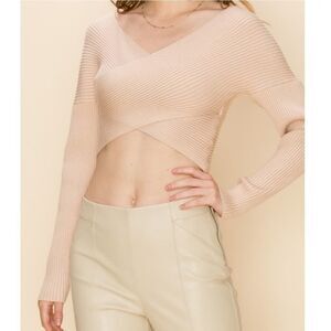 A unique criss-cross sweater made from comfy ribbed knit offers a versatile ultra chic attire.
