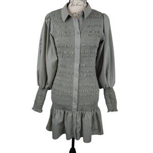 HYFVE | Smocked Balloon Sleeve Button Dress Olive Green Ruffle | Size L