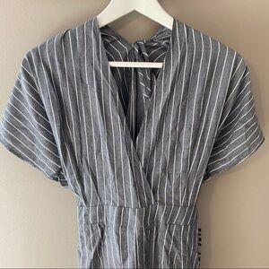 Style: Striped romper. Deep v-neckline