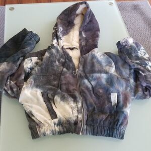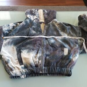 This adorable fully lined jacket is so over the top cuddly soft on the inside. It's nice and warm too! Tie-dye colors are blue, green, gray, and cream. B44.443