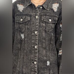 edgy acid wash finish, ripped details, and a relaxed oversized boyfriend fit that channels 90s street style and grungecore vibes. Perfect for layering, this destroyed black jean jacket pairs effortlessly with casual cool girl outfits, Y2K revival looks, or urban streetwear ensembles. The vintage-inspired wash and lightly frayed edges give it a soft grunge, indie sleaze appeal, while the longline cut adds a model-off-duty, retro rocker chic feel. Ideal for festival fashion, minimalist edgy styling, or even a dark coastal cowgirl twist, this washed black denim piece is a versatile staple for any fashion-forward wardrobe.