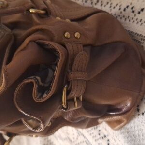 Stylish brown leather handbag. Features gold-tone hardware. Perfect for everyday use. Excellent preowned condition. Comes with dust bag.