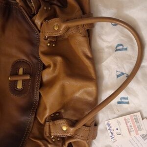 Genuine Hype Tan Pebbled Leather Handbag Purse. Satchel style. Super soft genuine leather. The top folds over and the turn lock opens to a very spacious interior. Suede on the inside of the fold over top. Side pockets with buckles. Color is tan with manufacturers darkening on fold over top and side pockets.