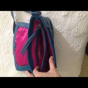 Bright blue leather, cross body purse with multiple pockets and zippers. Fabulous bright pink lining. This bag was used once! Perfect for spring!
