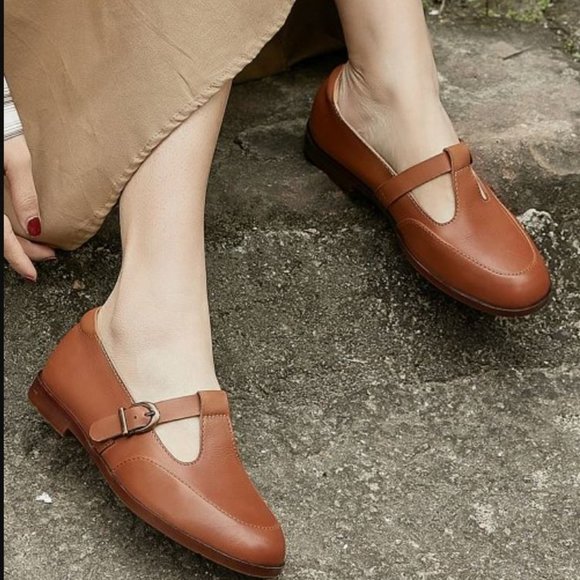 Luxe-leather loafer featuring a T-strap vamp, buckle closure, anti-slip sole, padded collar and top-stitch toe.