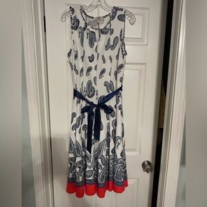 This dress has a fit and flare fit. It is sleeveless and a keyhole neck design for that extra flare. White, blue, and coral. Size 1X. Worn One Time.