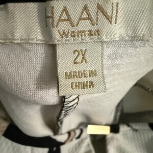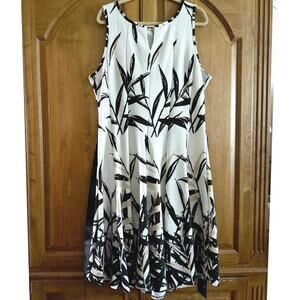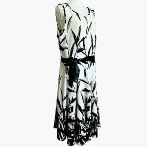 HAANI Fit & Flare sleeveless A line ribbed textured knit dress with satin tie belt, gorgeous flattering silhouette, floral leaf botanical print, brushstroke netral shades, knee to midi length, women's plus size 2x in excellent condtion.
