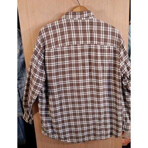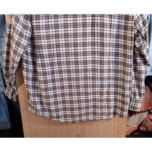 The Haband Casual Joe Flannel Shirt is a men's button-up shirt made of a combination of polyester and cotton. It features a maroon and gray plaid pattern with a collared neckline and long sleeves. The shirt has a spread collar style and is closed with pearl snaps. It is a regular fit and has a chest size of 44 inches. The shirt is machine washable and suitable for all seasons, with features such as being breathable and suitable for fall, spring, summer, and winter. The shirt is also vintage and has a classic theme.