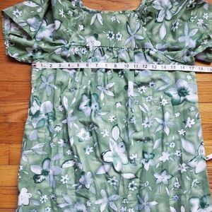 Charming green dress with a floral pattern and ruffle hem. Perfect for a casual day out.
