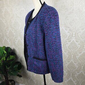 Multi color jacket has a vertical chevron (zigzag) pattern. Edged in black around the neck, down the front and at the top of the pockets. Five button closure. Two front slip pockets. Long sleeve. Fully lined.