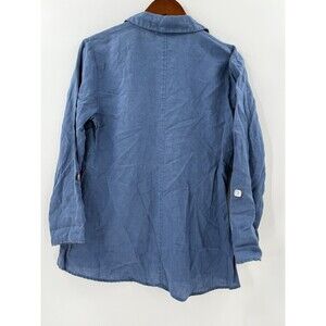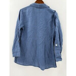 This Habitat 100% Linen Blue Women's Top features a collared neckline with mother of pearl buttons for a stylish closure. The swing bottom and oversized fit make it perfect for a relaxed, easy-to-wear look ideal for travel or casual occasions during the summer, fall, or spring seasons. Made from woven linen fabric, this tunic-style blouse has 3/4 roll tab sleeves and a solid blue color, offering a classic and versatile addition to any woman's wardrobe. Easy to care for with machine washable instructions, this top is designed for comfort and style with a relaxed fit in size small.