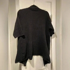 Black waffle knit linen blend short sleeve open front cardigan sweater