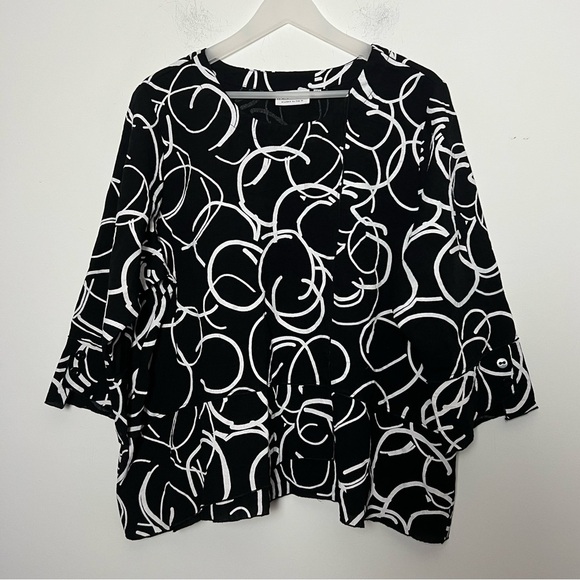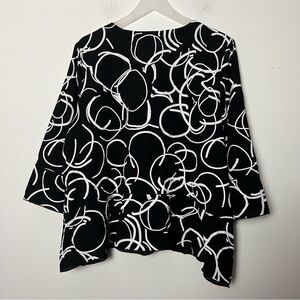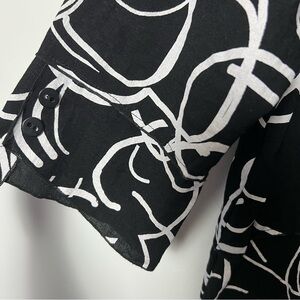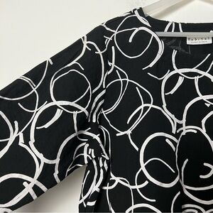 Modern black artsy blouse with bold white circular design. Rounded neckline. One seam down the front, 3/4 Wide sleeves with wide buttoned cuffs. Flattering fit. Ideal for versatile styling.