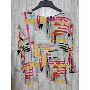 The Habitat Clothes To Live In top in size medium is a colorful and abstract blouse designed for women. With a 3/4 sleeve length and made from a combination of spandex and rayon, this top offers a comfortable and stylish option for everyday wear. The multicolor design adds a unique and vibrant touch to any outfit, making it a versatile piece for any wardrobe.