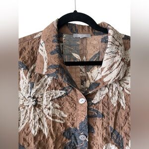 Habitat Clothes to Live In Brown Button Up Floral Crinkle Blouse XL. Shirt is a collared button up blouse. Lightweight crinkle material. Buttons are oval shaped and there is button detailing on the back of the blouse as well. In great condition with no tears, snags, holes, etc.