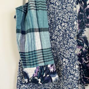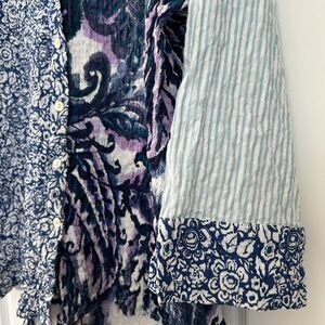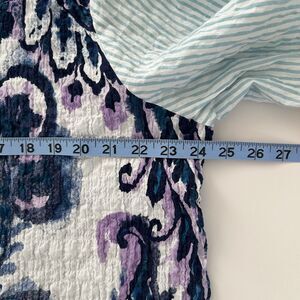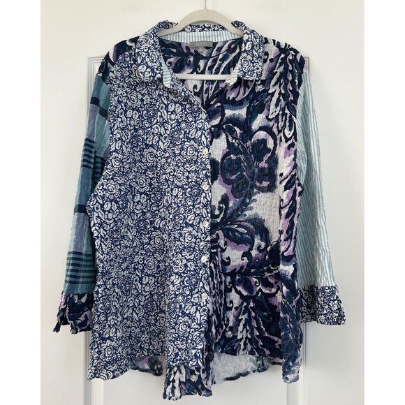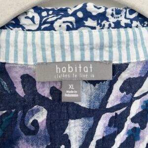 Habitat Clothes to Live In Mixed Print Blouse Size XL Crinkle Artsy 3/4 Sleeve Blue Stretch.