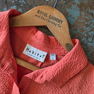 Habitat women's textured lightweight button up tunic top with lacing details at back and cuffs, size small. In gently preowned condition, no flaws noted.