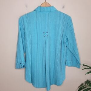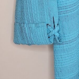 Textured turquoise blue 3/4 sleeve top with horizontal & vertical stripes on the front.