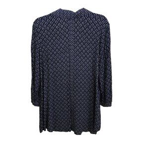 This lightweight, all-season Habitat blouse features a stylish high-low hem and Mother of pearl button front. Its classic design in a navy eyecat pattern ensures versatility and chic appeal for any occasion.
