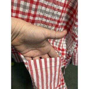 The Habitat Red Plaid Textured Button Down Shirt Top is a stylish and versatile addition to any woman's wardrobe. Made from a comfortable cotton blend fabric with a textured down feel, this shirt features a retro-inspired red plaid pattern, 3/4 sleeves, and a collared neckline with button closure. Perfect for various occasions including travel, parties, casual outings, and business meetings, this relaxed fit shirt in size Large is lightweight, breathable, and easy to care for with its machine washable design. Add a touch of hipster, bohemian, or classic style to your outfit with this colorful and timeless piece.