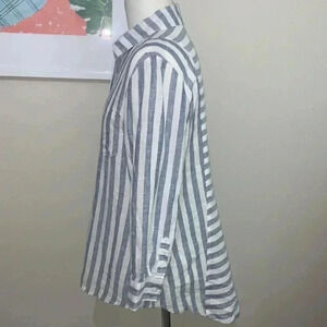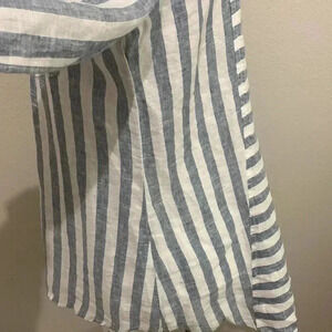 Perfect summer linen blouse from habitat. Wide stripe, longer almost tunic length. Adorable square buttons. Wear open over a tank with jeans or with your favorite white linen pants for a whole ensemble! Could also be used as a bathing suit cover up. Very oversized fit. Xs, but loose on my size 4 mannequin.