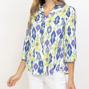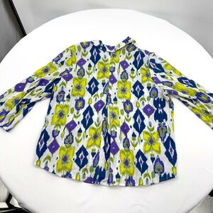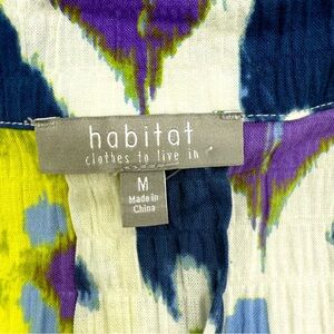 Habitat Retro Swing Shirt in Ikat Garden Print Size Medium. Blue, purple and Green, Lightweight, mother of pearl buttons, excellent used condition. Perfect material for travel. Please see photos for measurements to ensure fit.