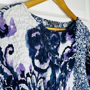 Add some excitement to your wardrobe with this Habitat Stir It Up Patchwork Floral Cropped Sleeve Top. The colorful floral pattern and crinkly accents make it a perfect choice for travel or casual occasions. The top features a round neckline and 3/4 sleeves, providing a comfortable fit for regular use. The cotton material adds to the comfort and durability of the blouse. This women's top comes in a size small and is suitable for any regular-sized woman. The top is a perfect addition to your collection and can be paired with any suitable bottom to complete your look.
