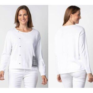 Great for year round weather with is fresh cotton knit sweater with rolled hem. Dot embroidery down the front and patch black marled pocket. Split hem.