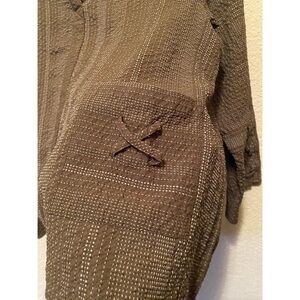 Chic textured blouse with a relaxed fit. Features a stylish front pocket. Ideal for casual wear. Color is similar to a a taupe mixed with tan accents.