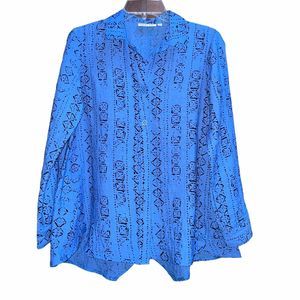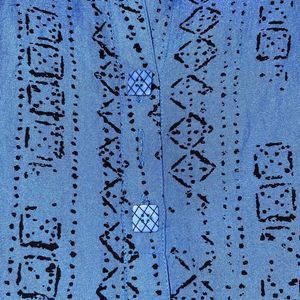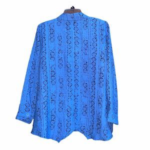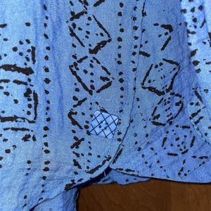 Artsy Habitat tunic, cobalt blue with black geometric print, hidden button panel with cute square buttons. Rayon blend. Gently worn.