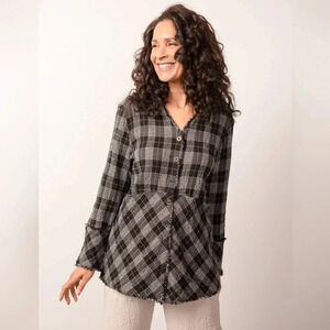 Habitat Clothes to live In tunic in black and white plaid pattern. Band collar, v neck and button front. Long sleeve with bell cuffs. Stretch cotton blend. Soft crinkle fabric. Oversized fit. Bust 24” length 28” Excellent condition. Size M