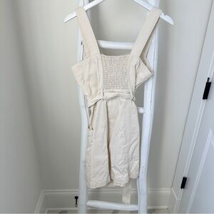 •This cream denim sundress features a chic square neckline and a buttoned front, perfect for casual settings. Its sleeveless design and mini length make it ideal for warm weather, offering a stylish yet comfortable fit. Can also be worn in cool weather with cowboy boots and leather jacket.