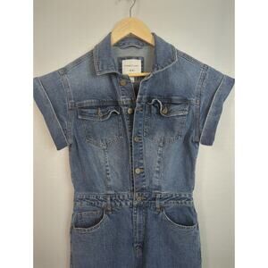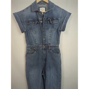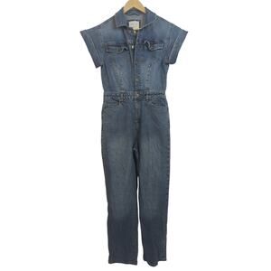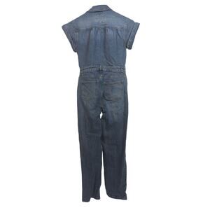 Cuffed sleeves frame a denim jumpsuit crafted from stretch-enhanced cotton with straight legs for a casual feel.