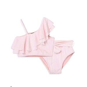 A striped design and ruffle detail decorate this stylish two-piece swimsuit. 84% Nylon & 16% spandex. Machine wash.